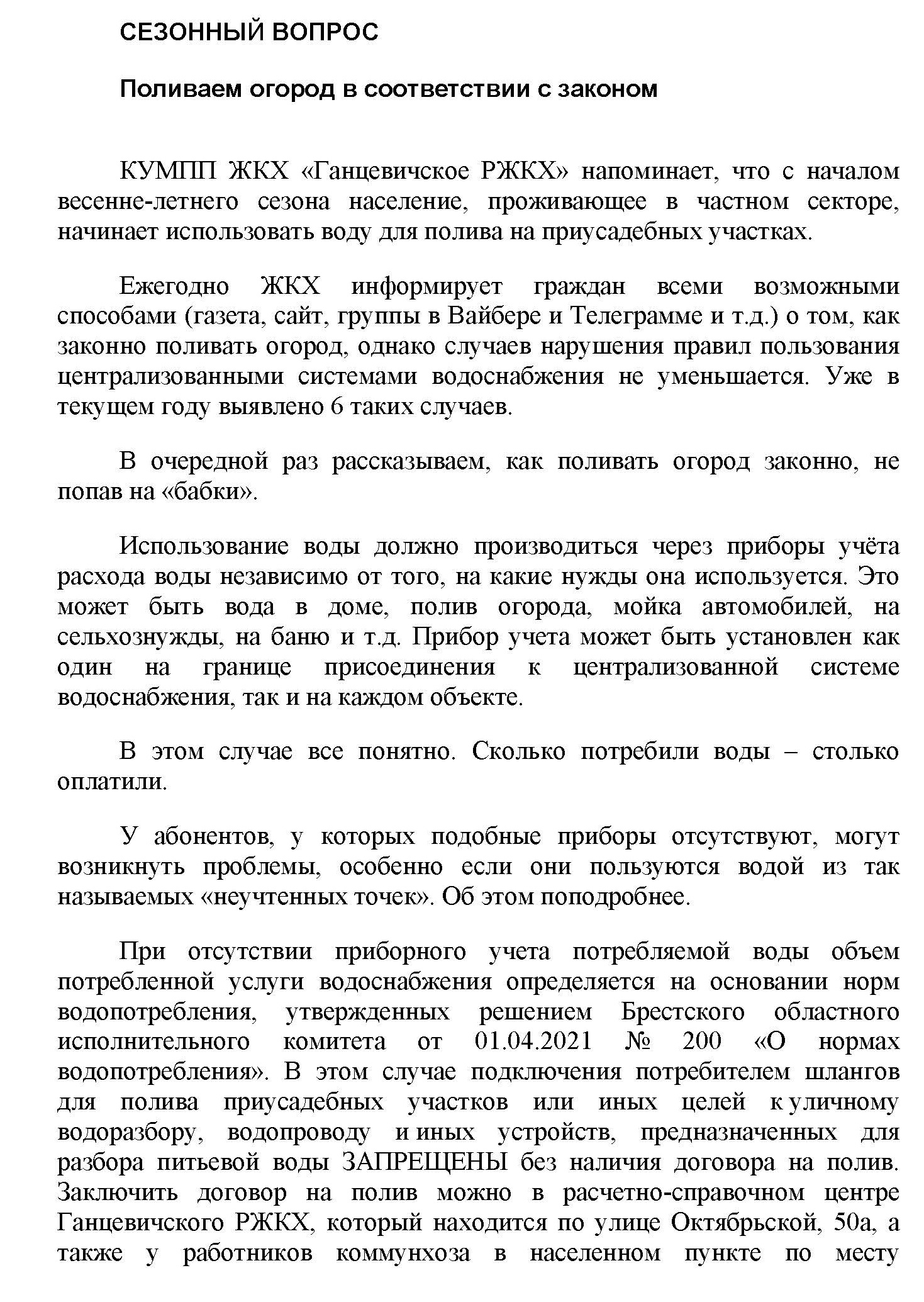 – В расчетно-справочном центре Ганцевичского РЖКХ, который находится по улице Октябрьской, 50а. Также договор на полив приусадебного участка можно заключить у работников ЖКХ в населенном пункте по месту проживания. Данный документ заключается на неопределенный срок, поэтому гражданам, которые ранее его оформили, перезаключать его не надо.