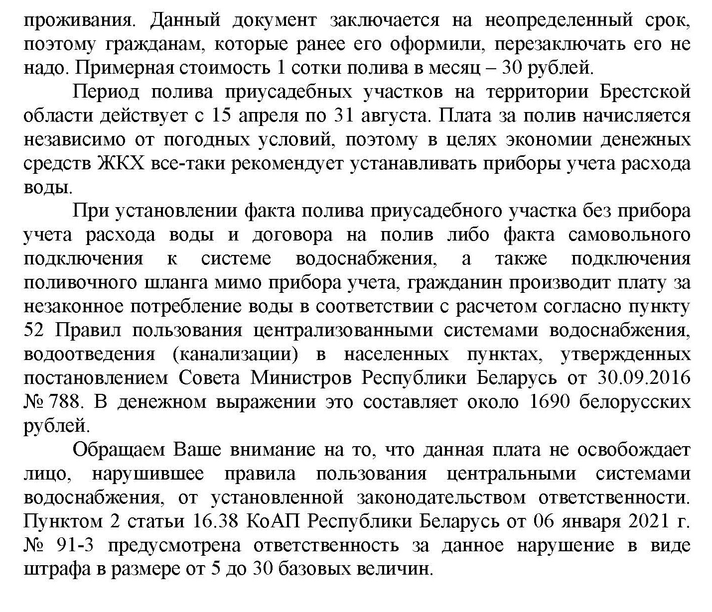 – При установлении факта полива приусадебного участка без прибора учета расхода воды и договора на полив либо факта самовольного подключения к системе водоснабжения гражданин производит плату за потребленные услуги в соответствии с расчетом согласно пункту 52 Правил пользования централизованными системами водоснабжения, водоотведения (канализации) в населенных пунктах, утвержденных постановлением Совета Министров Республики Беларусь от 30.09.2016 № 788. Количество израсходованной воды определяется по пропускной способности водопроводного ввода (подключения) при скорости движения воды в нем 2 м/с и действии его полным сечением в течение 24 часов в сутки. Временной период, за который производится расчет объемов воды составляет тридцать суток. В денежном выражении это составляет 1230 белорусских рублей.
