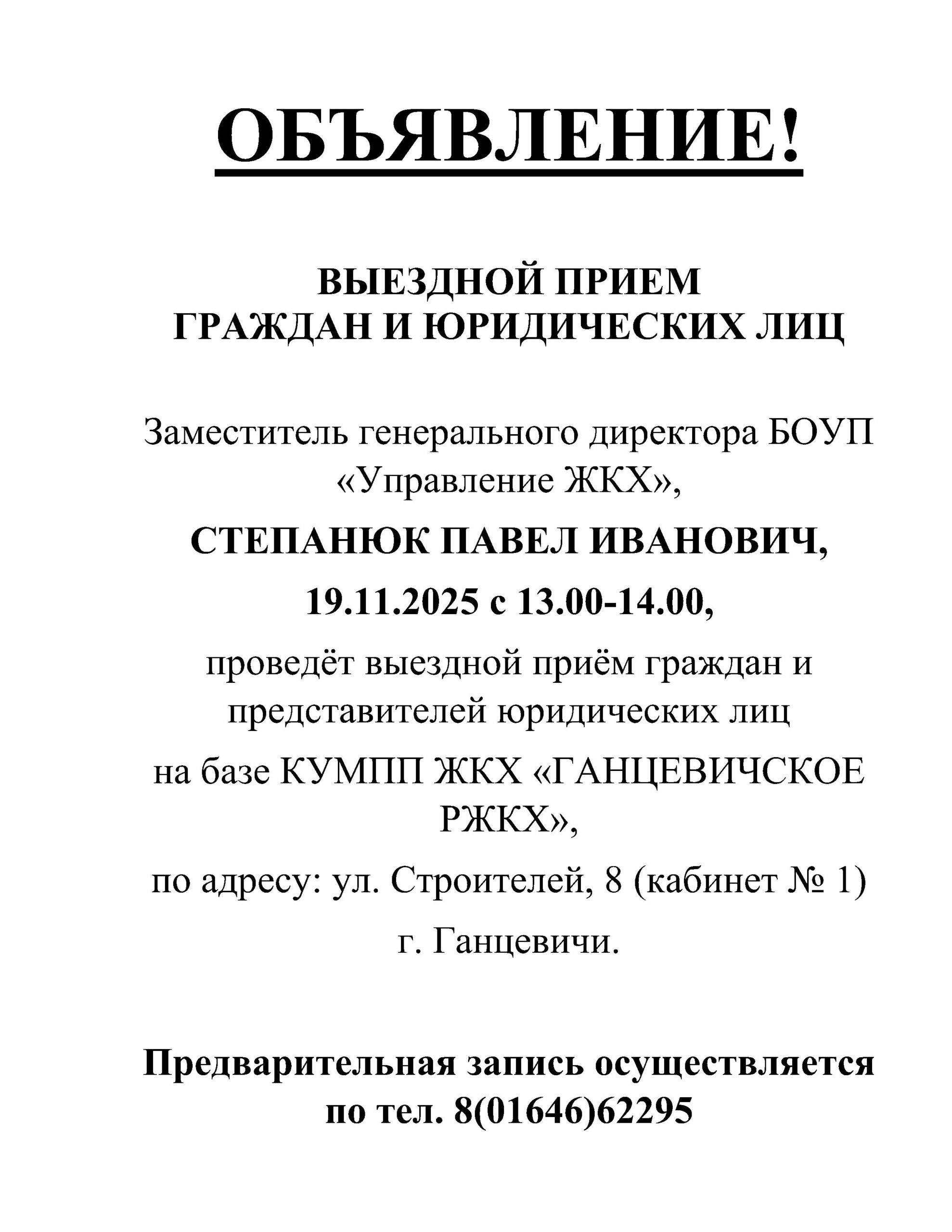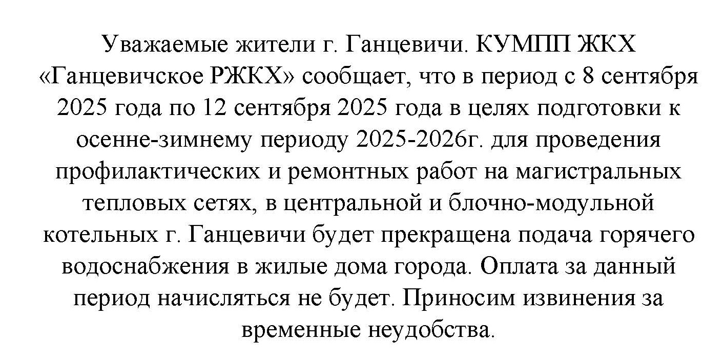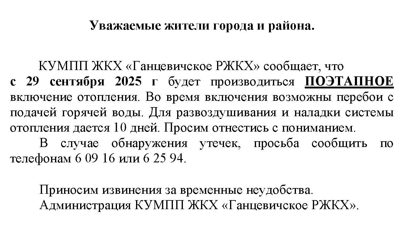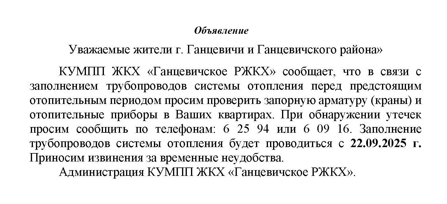 КУМПП ЖКХ “Ганцевичское РЖКХ” сообщает, что 10 октября будет производится